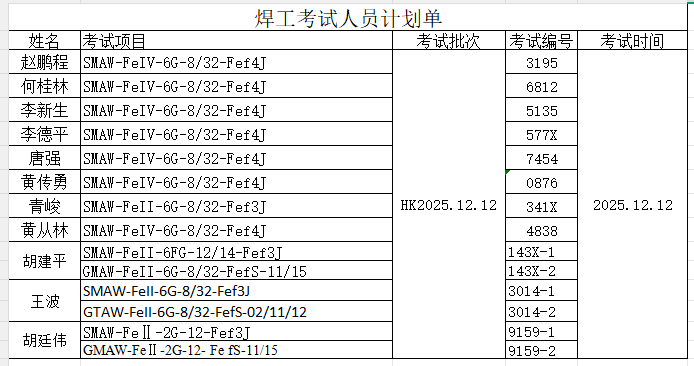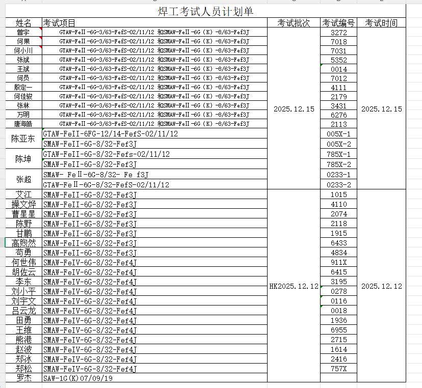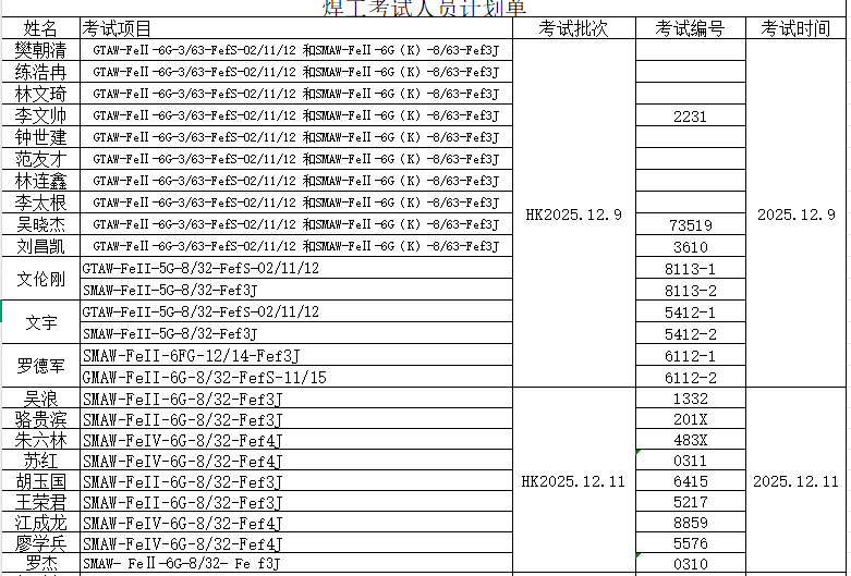 煌榫工考試人員計劃單20251209-20251215